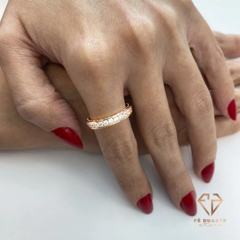 Aliança Fina Cravejada de Zircônias Cristais nos Banhos: Ouro e Ródio Branco. Tamanhos: Ouro 17, Ródio Branco 16, Ródio Branco 17.