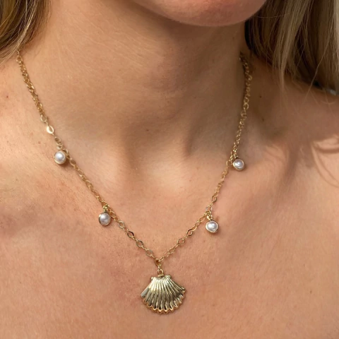 O design traz pingentes delicados de pérolas, que adicionam sofisticação atemporal, e uma concha central de 2 cm por 2 cm no banho de ouro, símbolo de proteção, feminilidade e conexão com a natureza. Uma peça versátil, ideal para valorizar o colo e compor looks do dia a dia até produções mais sofisticadas.