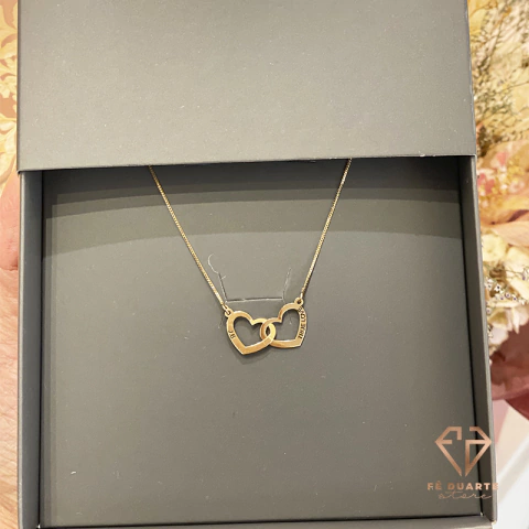 Colar Corrente Veneziana com 2 Corações Vazados com Personalização no Banho de Ouro. Tamanho 45 cm.