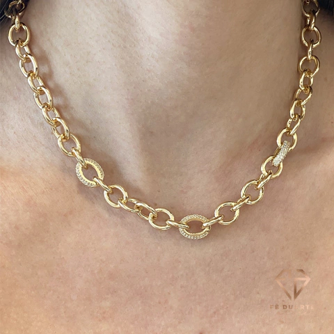 Colar Luisa 3 Elos Ovais Cravejados de Zircônias nos Banhos: Ouro e Ródio Branco. Tamanho: 40 cm (aberta). Abertura e Fechamento bem discreta através do elo oval cravejado localizado no meio (foto no banho de ouro).