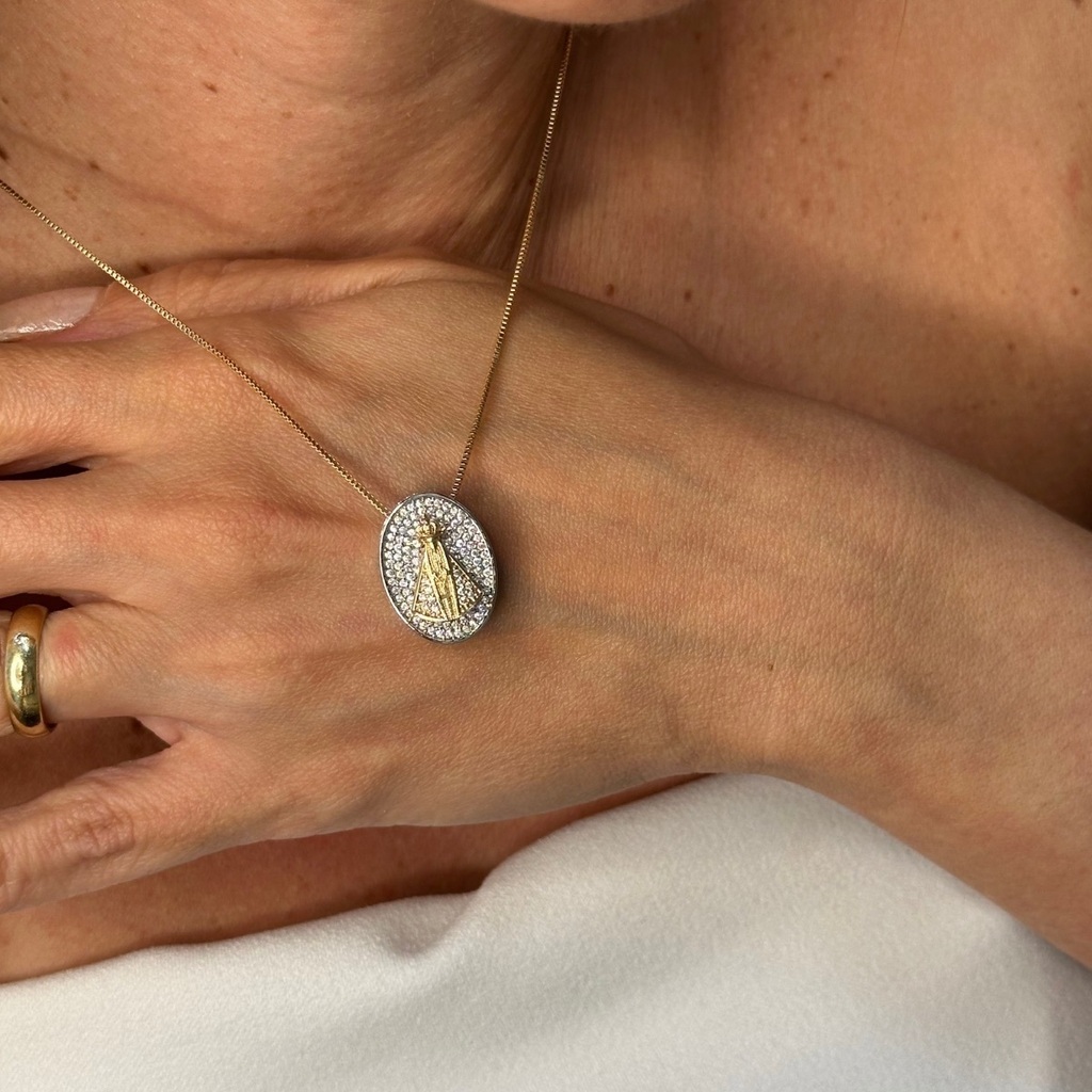 Celebre sua fé com elegância e sofisticação com o Colar Nossa Senhora Aparecida em banho de ouro 18k, um acessório que une devoção, design moderno e brilho incomparável. A peça traz uma corrente veneziana delicada que sustenta o pingente da Santa padroeira do Brasil, todo cravejado com zircônias de alta qualidade em um exclusivo mix de banhos: ródio branco e ouro 18k, criando um contraste luxuoso e atemporal.