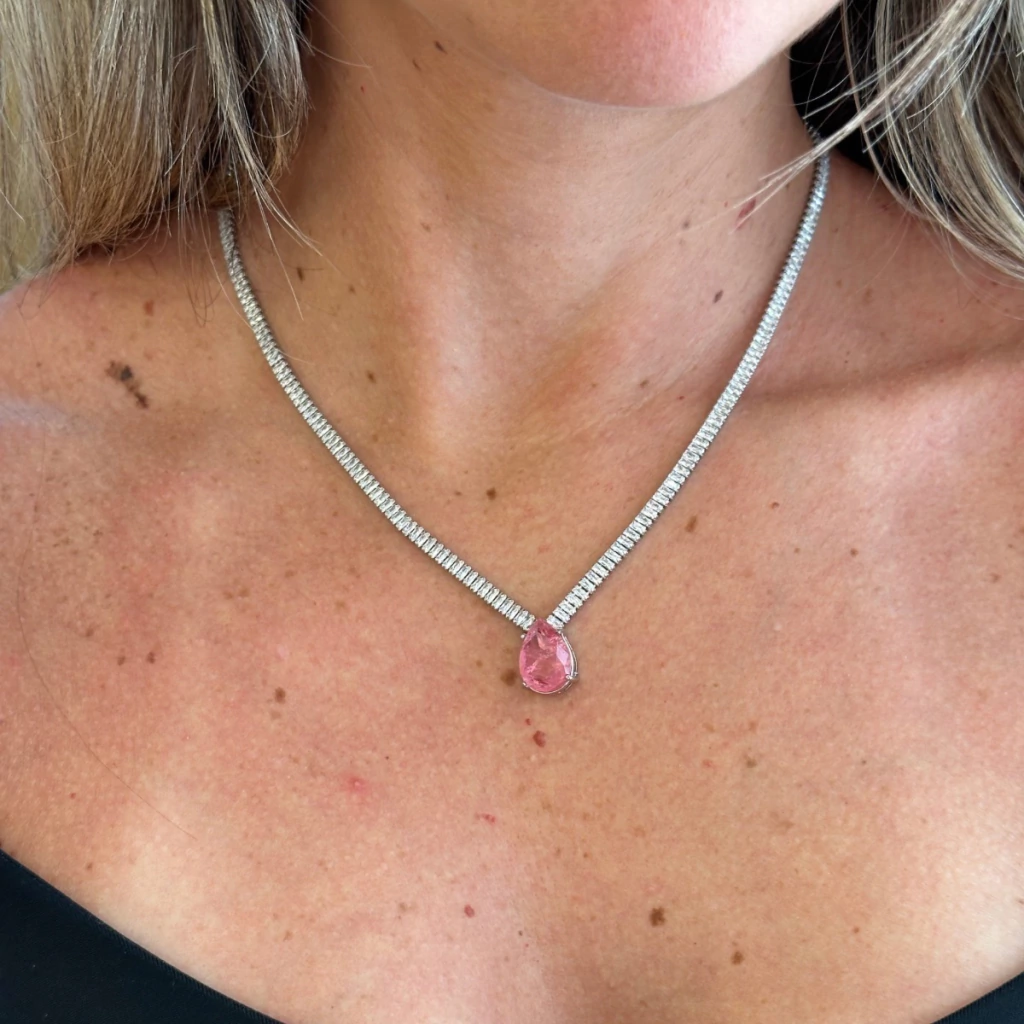 Colar Riviera Baguete no Banho de Ródio Branco com Zircônias Cristais e Pingente em Cristal Rosa Fusion – Luxo e Delicadeza em uma Só Joia