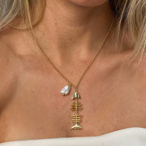 Seu design exclusivo traz um pingente em formato de espinha de peixe com 4,5 cm, símbolo de prosperidade e proteção, acompanhado por uma pérola clássica de 1 cm, que adiciona sofisticação e delicadeza à peça. Ideal para mulheres que buscam joias com personalidade, estilo e acabamento premium.